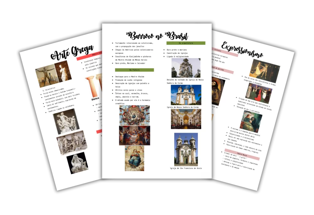 Resumos que percorrem desde a Arte Pré-Histórica até o Modernismo, explorando estilos como Barroco, Neoclassicismo, Realismo e Expressionismo. Destaque para manifestações artísticas no Brasil e no mundo.
