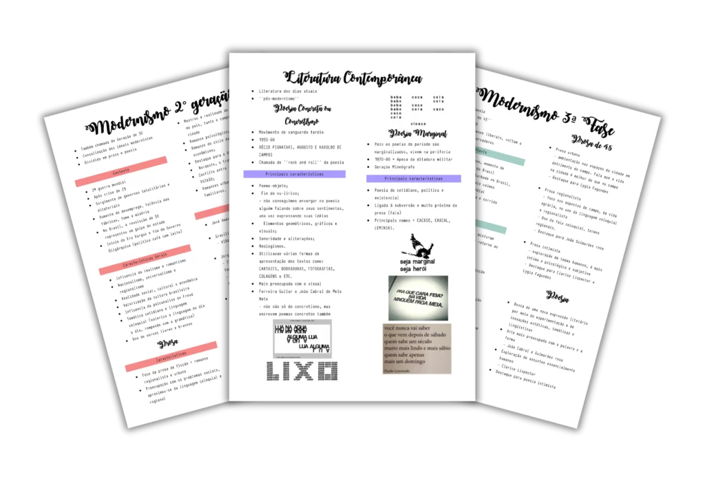 Resumos sobre as principais escolas literárias, do Trovadorismo ao Modernismo, explorando a evolução da Literatura Brasileira e suas fases no Brasil Colônia, Império e República, até a Literatura Contemporânea.